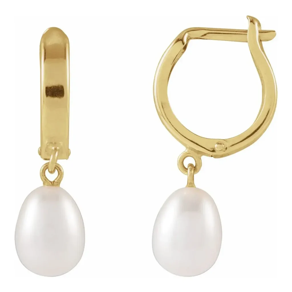 These stylish yet romantic earrings feature cultured freshwater pearls that dangle from sleek yellow gold huggee hoops.